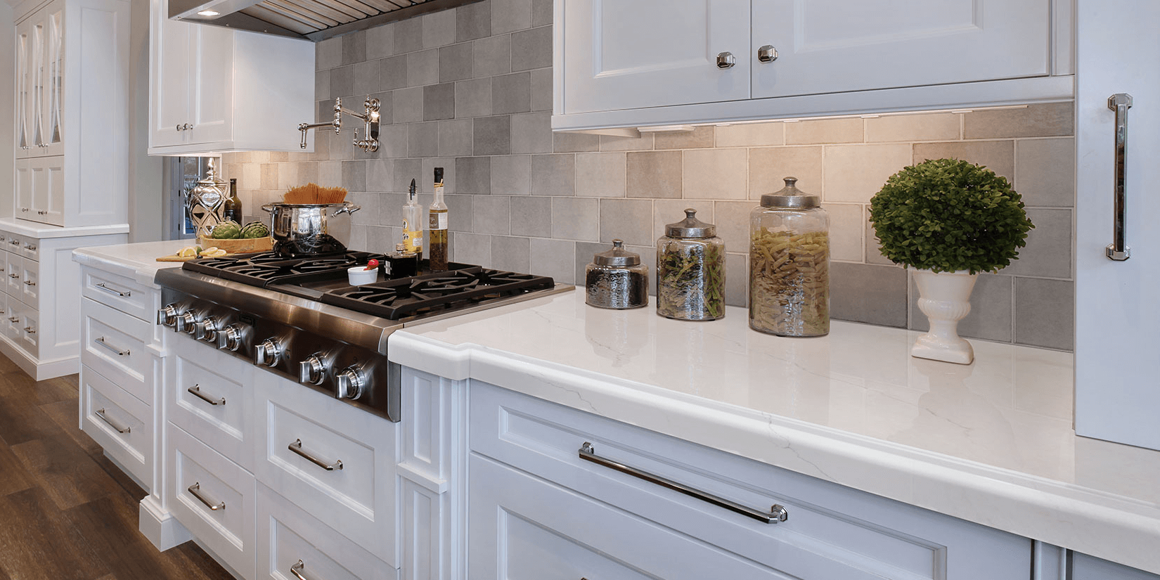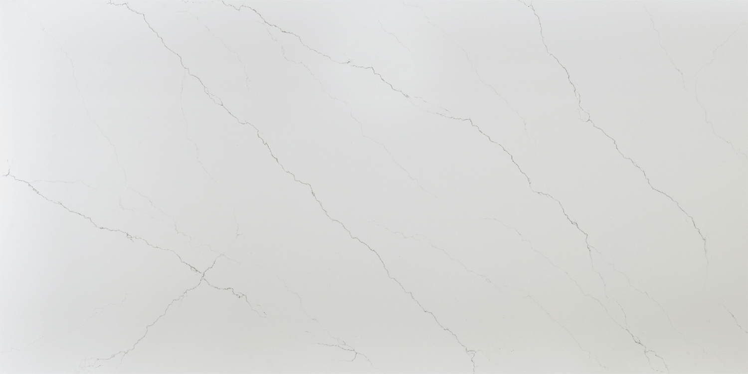 Sample of Calacatta Miraggio Quartz slab, polished finish, cool white background with elegant grey veining, Made in USA